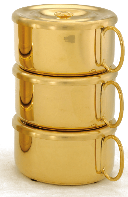 Designed for efficiency, this stacking ciboria set provides stable and organized capacity for up to 480 standard communion hosts across three vessels. The full set stands at a practical 7-7/8" inches in total height, making it a highly functional and beautiful piece of altar ware for medium to large congregations.