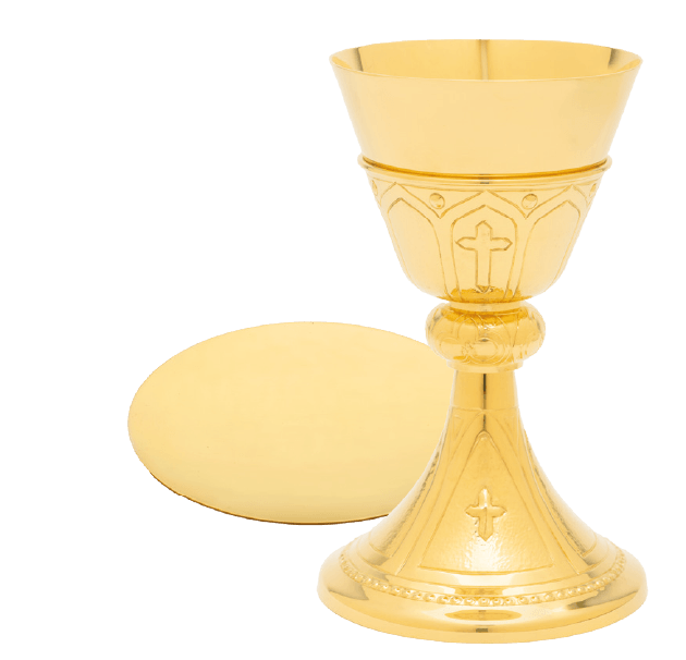 The Arches of the Covenant chalice is a masterwork of design, featuring a series of elegant architectural arches brought to life through meticulous hand-chiseled craftsmanship. Standing at 7-1/4 inches, its compact yet sturdy profile offers a unique tactile feel and a brilliant, light-catching texture. This set is completed by a matching 5-1/2 inch scale paten, ensuring a seamless and dignified presentation.