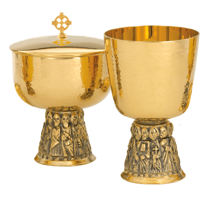 This beautiful Chalice is crafted with meticulous attention to detail, featuring a brilliant 24K gold plating that ensures lasting radiance and devotion. It is an exquisite piece for the celebration of the Eucharist, standing 6" in height with a generous capacity of 16 oz. The design is both historically rich and profoundly sacred, highlighted by the intricate Apostles base that lends stability and spiritual significance. The cup is contrasted with a subtle, elegant Hammered Texture, adding a unique warmth and focus to the sacrifice. This piece is complete with a coordinating 6-1/8" bowl paten, making it a truly high-quality and lasting set for your altar. A matching ciborium B-2401G, is also available. Measuring 6½" inches in height and holding 225 hosts, it mirrors the chalice’s elegant design and 24K gold finish, offering a dignified and complete presentation.