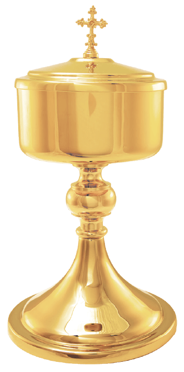 This beautiful Ciborium (Model B-102G) is a reverent and stunning vessel essential for the dignified administration of the Eucharist. The entire piece is richly plated in brilliant 24K gold, providing a luminous and lasting finish for the altar. The design is elegantly enhanced with a distinctive gold node on the stem and a sacred cross accent adorning the top of the lid. Standing at a generous 9-1/2 inches in Height, this substantial Ciborium offers a practical and secure capacity for approximately 175 Hosts, making it an ideal choice for large Masses and ensuring ample supply for the faithful