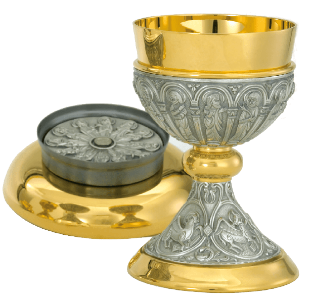 The B-4134G Ciborium is an essential and reverent vessel designed to perfectly complement the Apostles Chalice, featuring the same magnificent two-tone design. The piece is primarily plated in brilliant High Polish 24K gold and dramatically contrasted with a detailed silver-ox raised motif (assumed to match the Apostles theme). Standing at 8 ¼ inches in Height, this Ciborium offers a practical and secure capacity for approximately 185 Hosts, making it an excellent choice for a cohesive and symbolic altar setting. For individual use or supplementary needs, a single piece with a matching cover is also available.