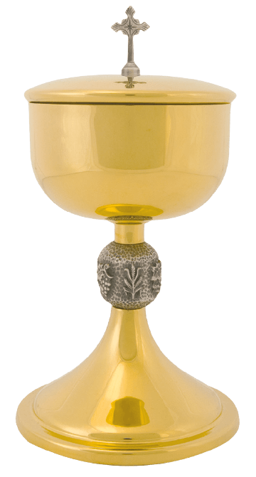 Holy Eucharist. It is a sacred vessel of devotion, impressively sized at 9-1/4" in height with a substantial capacity for 225 hosts, making it ideal for large