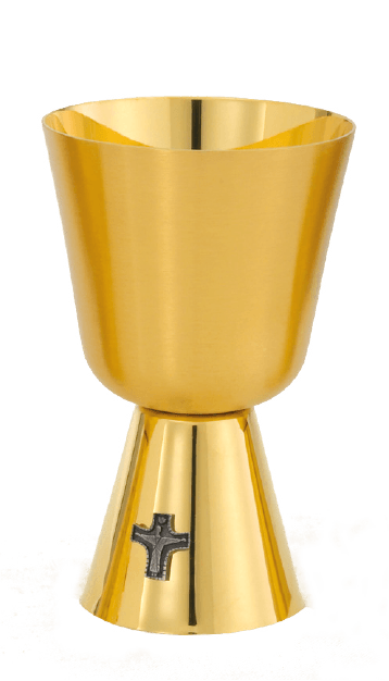 This beautiful Communion Cup is meticulously crafted and plated completely in radiant 24K gold, featuring a sophisticated contrast between its finishes. It is a perfectly proportioned sacred vessel, standing at a devotional 6" in height with a generous 11 oz. capacity. The design features an elegant Satin Cup for reduced glare, perfectly balanced by a gleaming High Polish Base. The piece is subtly highlighted by a reverent Silver-Ox Cross accent, adding a touch of distinct detail. This is a high-quality, lasting piece that brings a sense of beauty and devoted focus to every celebration of the Holy Eucharist.