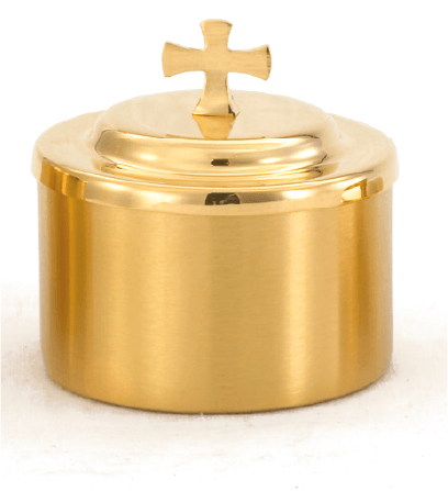 This exclusive Host Box is finished in a smooth Satin Gold (24K plated) and is marked with a simple, elegant Gold Cross accent on the lid. This durable box ensures the hosts are secured and protected, while the subtle cross offers a beautiful visual reminder of its sacred purpose. A high-quality, compact piece, essential for any sacristy or ministry service.