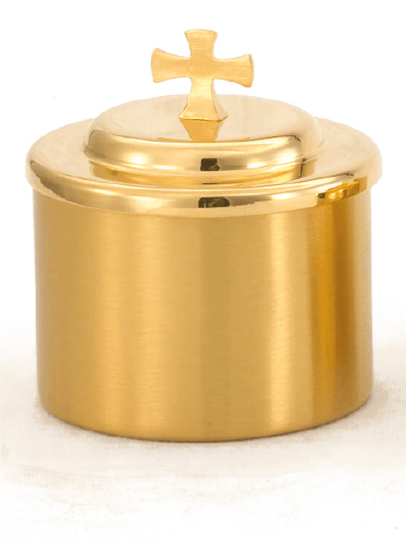This beautifully made, exclusive Host Box is finished in a smooth Satin Gold (24K plated), providing a durable and reverent exterior. The lid features a simple, prominent Gold Cross accent that clearly marks its sacred contents. Its ideal compact size ensures hosts are securely protected for transport during hospital, home, or ministry visits. An essential tool for the caring minister.