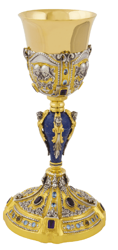 A premier vessel of exceptional artistry, this Italian chalice stands 10-1/2 inches tall and is elegantly adorned with genuine Amethyst stones. The regal purple gems complement the high-quality finish, creating a truly sacred aesthetic.