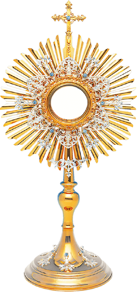 This gorgeous Monstrance is plated entirely in radiant silver, making it a stunning centerpiece for Eucharistic Adoration. Its design features exquisite