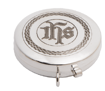 This beautiful silver plate pyx is an essential and classic liturgical vessel, providing a reliable means to safely and reverently transport the Precious Body of Christ.