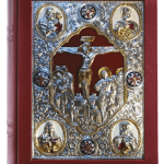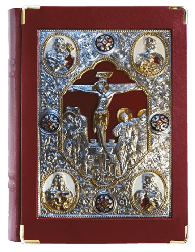 Elevate the beauty and reverence of your liturgical celebrations with this exquisite Gospel Book cover, featuring a stunning gold-plated and silver-plated icon of The Crucifixion of Christ surrounded by the Four Evangelists. Expertly crafted in rich burgundy leather, this cover showcases remarkable detail, from the ornate metalwork on the front to the elegant gold-accented cross design on the back. Designed with both durability and elegance in mind, the cover is finished with protective end caps and accommodates books up to 10" x 14" x 1-3/4" . Each piece includes a sleek black vinyl storage case for added protection when not in use. Natural variations in leather color add to the uniqueness and character of every cover.