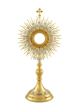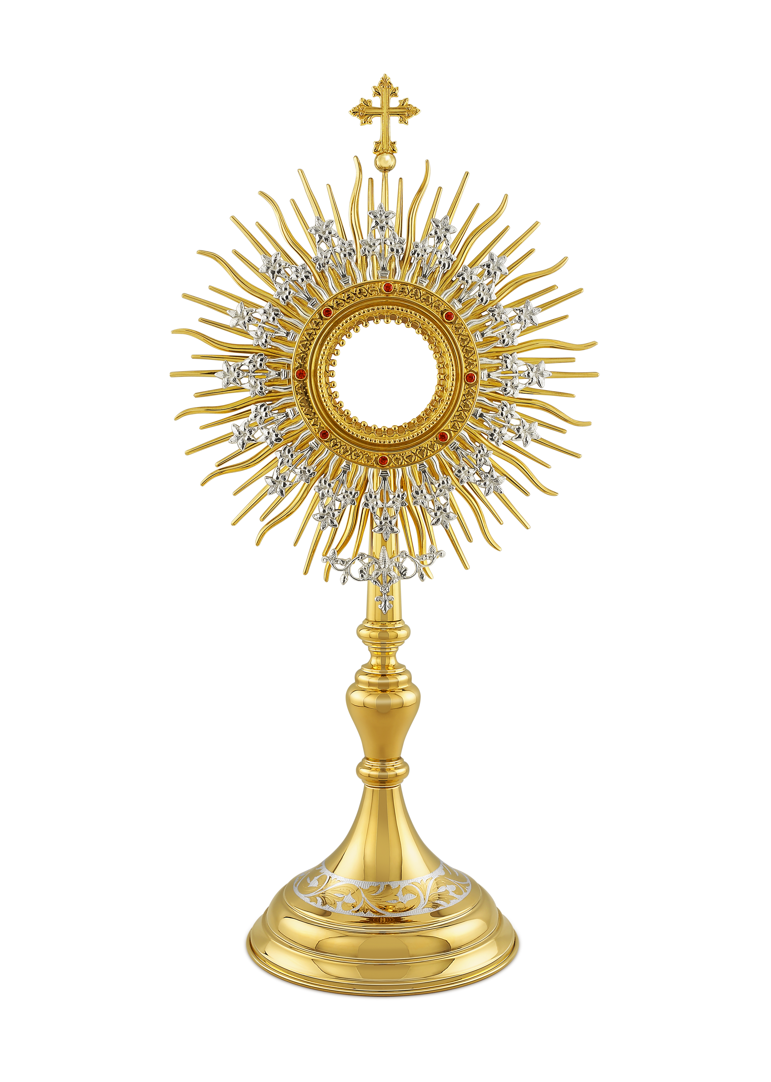 Beautiful 23" Monstrance. Gold and silver plated floral layers of open filigree with clear stones.